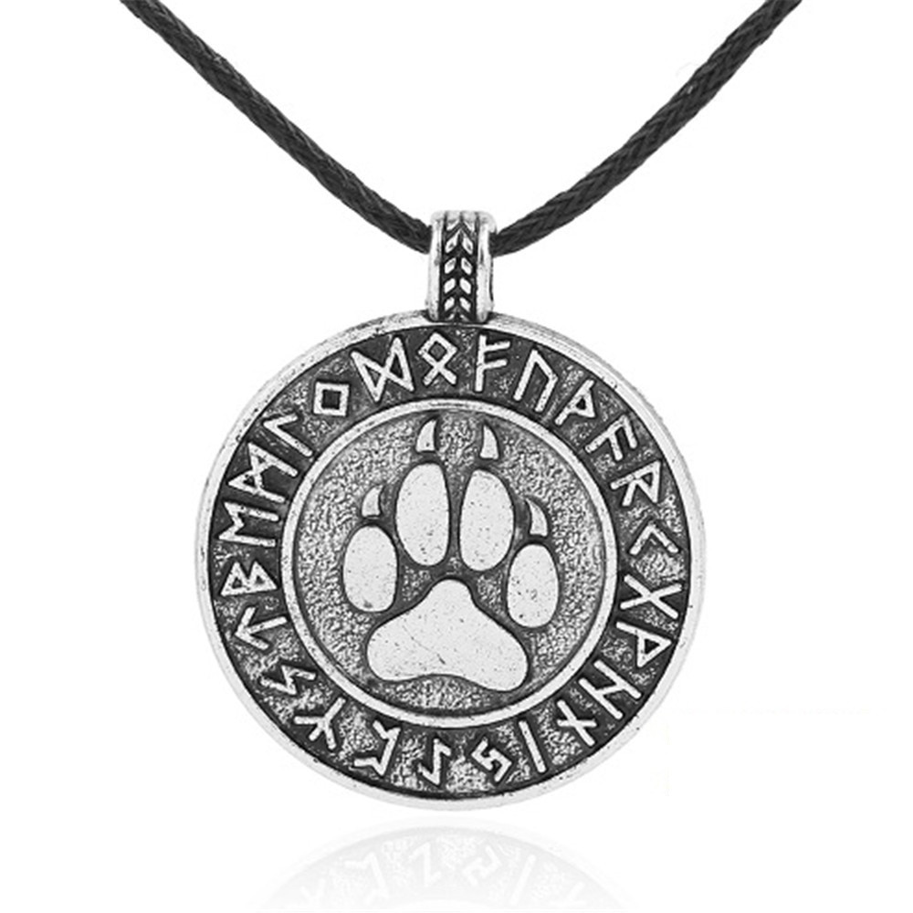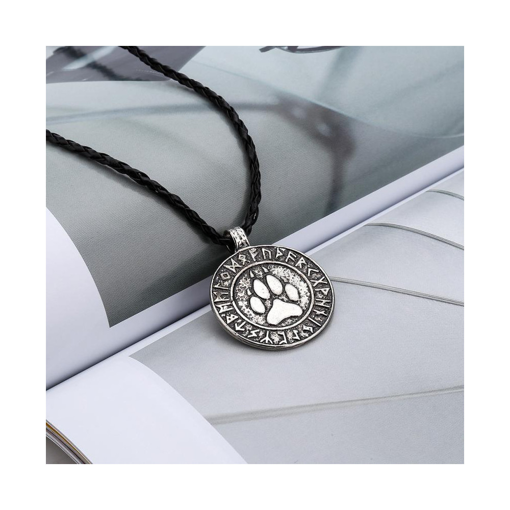 Stříbrný přívěsek s vyobrazením vlčí stopy, obklopený runovým kruhem, přináší silnou symboliku ochrany a spojení s totemovým zvířetem. Závěs je vyroben z černé pletené šňůrky o délce 45 cm a působí elegantně i mysticky.