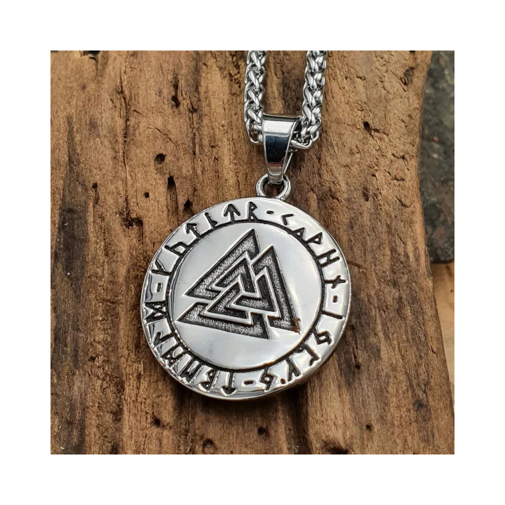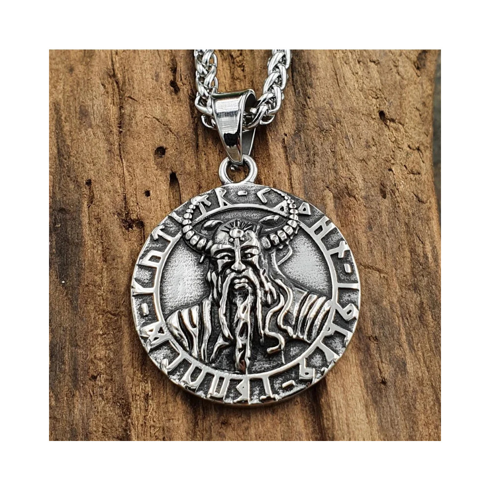 Dominantní motiv vikinga s rohatou přilbou doplňuje runový nápis kolem dokola, který umocňuje dojem starobylé magie a ochrany. Díky svým rozměrům 35 x 30 mm a nastavitelnému řetízku (45 + 5 cm) se skvěle hodí jako výrazný doplněk pro každodenní nošení i speciální příležitosti.