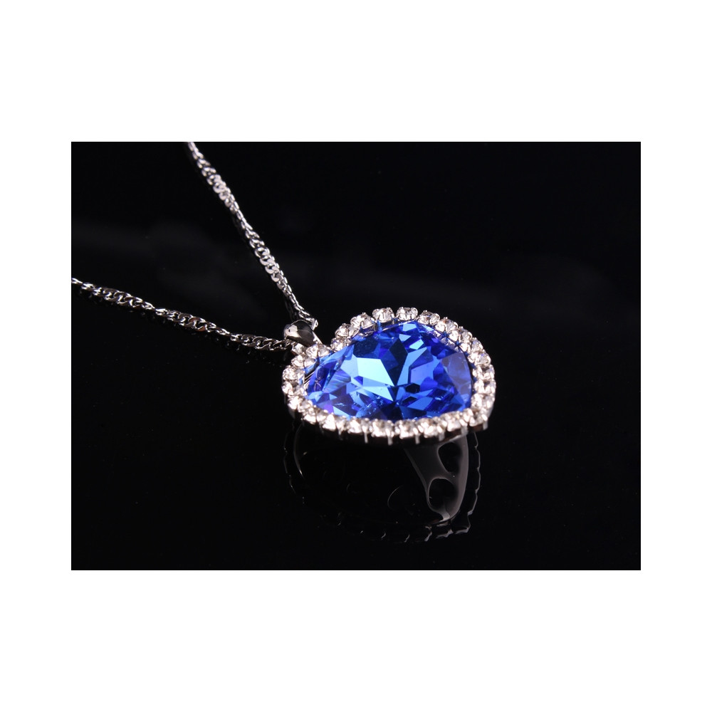 Luxusní náhrdelník Srdce oceánu z Titanicu s modrým krystalem a třpytivým lemováním, délka 42+5 cm, přívěsek 2,5×2,5 cm.