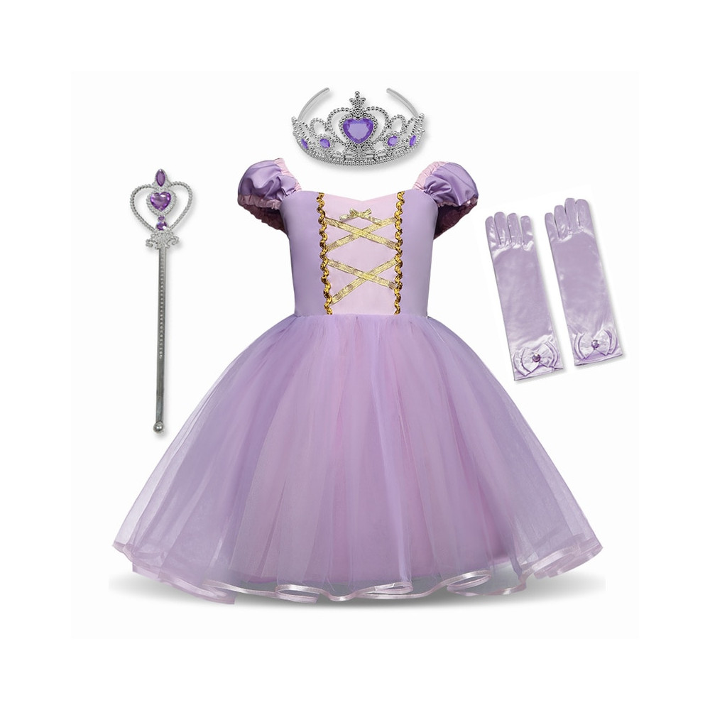 Kouzelný dětský kostým Lociky z pohádky Na vlásku. Krásné fialovo-růžové šaty s třpytkami a zlatými detaily jsou perfektní pro malé princezny!