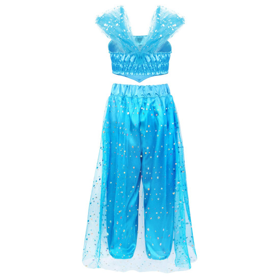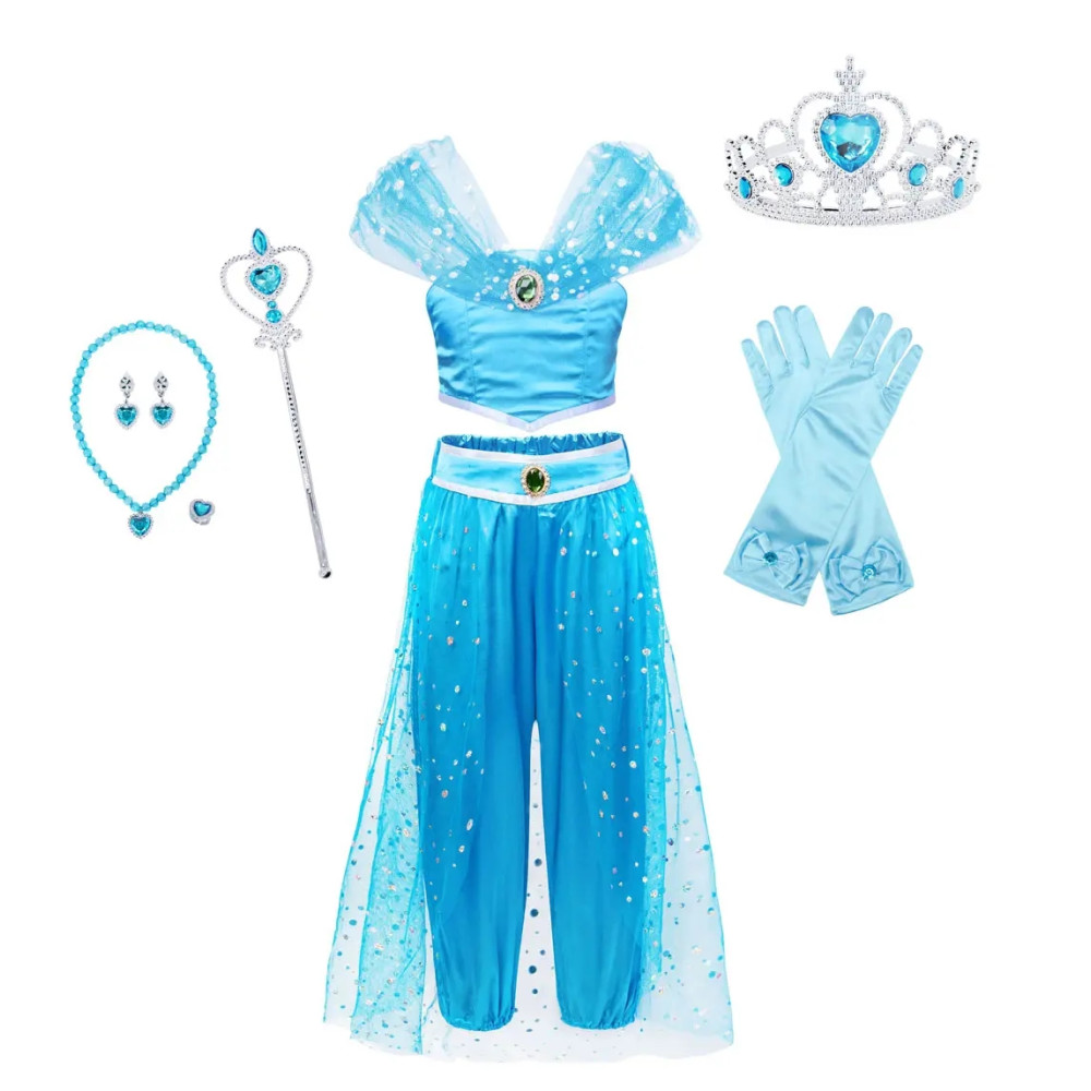 Dopřejte své malé princezně kouzelnou proměnu s dětským kostýmem Aladin – Jasmina 2 s příslušenstvím. Tento nádherný set zahrnuje saténový top, volné kalhoty s třpytivým závojem a sadu královských doplňků – korunku, hůlku, rukavice, náhrdelník, prstýnek a náušnice, které vytvoří autentický pohádkový vzhled.