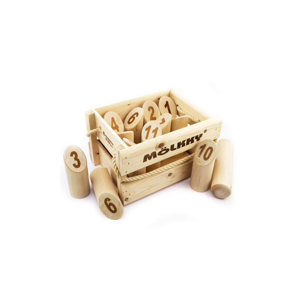 Mölkky (Moelkky) venkovní hra původem z Finska podobná hře Kubb nebo ruské hře gorodki. Mölkky mohou hrát jednotlivci i družstva všech věkových kategorií. Součástí je praktická dřevěná přenoska.