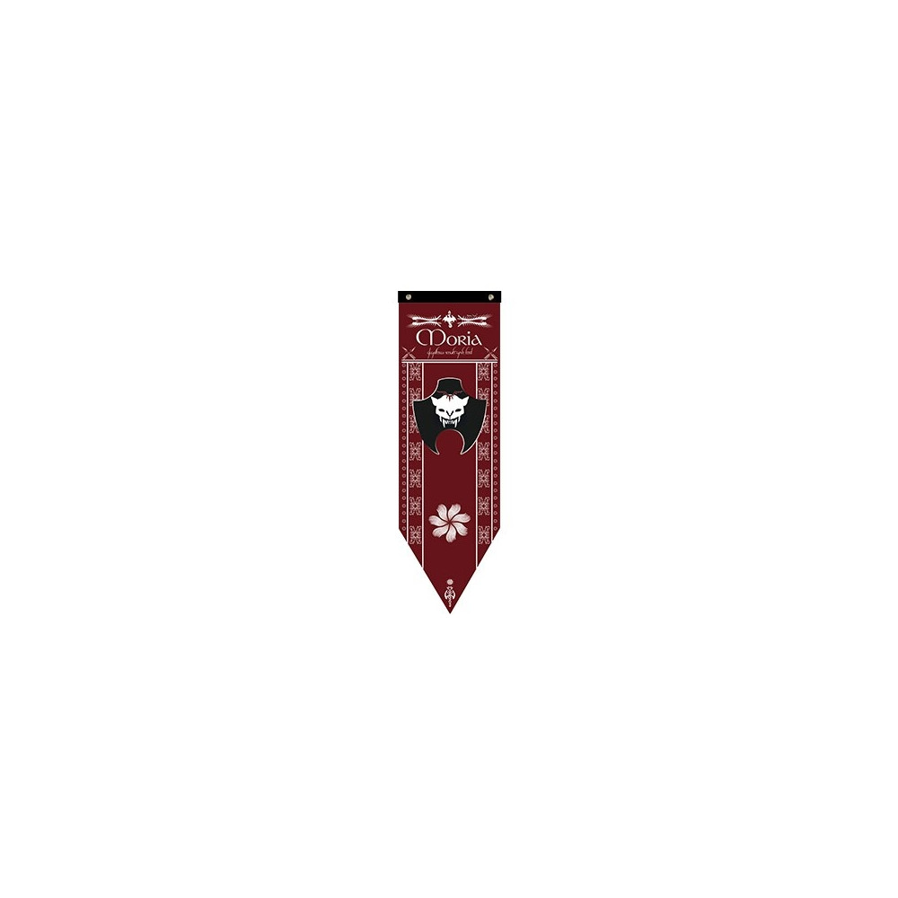 Temně rudý podklad zdobí znak lebky s rohy, gotické prvky a nápis "Moria" doplněný elfskými runami. Vlajka působí silně, temně a respekt vzbuzujícím dojmem – ideální pro každého fanouška Středozemě, který miluje její tajemnější stránku.